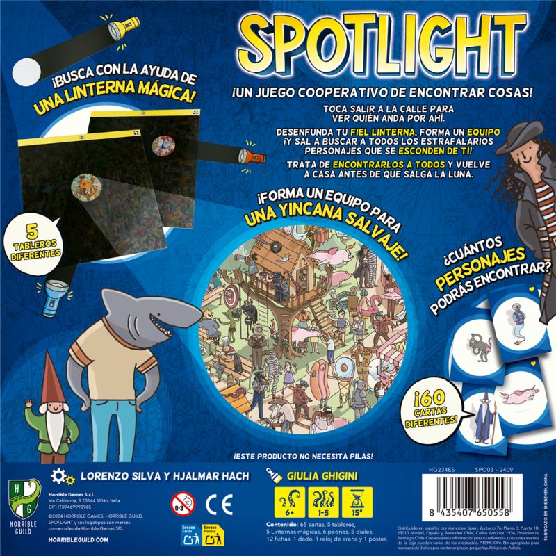 Spotlight és un joc cooperatiu on tothom col·labora per descobrir el màxim número de personatges ocults. Jugueu 5 rondes, ajudeu-vos mútuament i assegureu-vos que ningú arribi a casa massa tard!