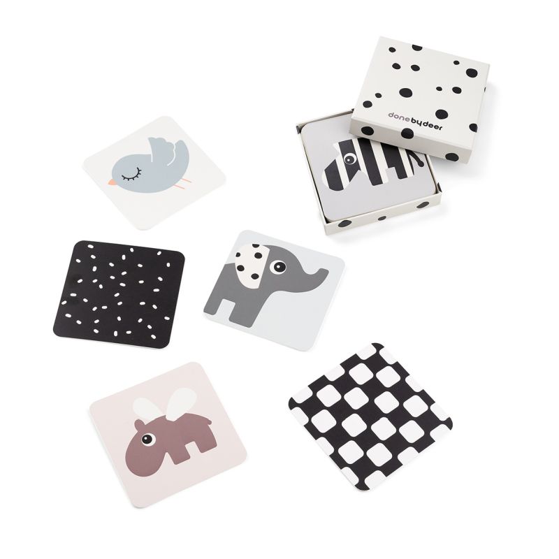 Les targetes tenen il·lustracions dels personatges de Done by Deer, amb formes vistoses i contrastos en blanc i negre, que criden l’atenció del petit i ajuden a desenvolupar la seva visió.